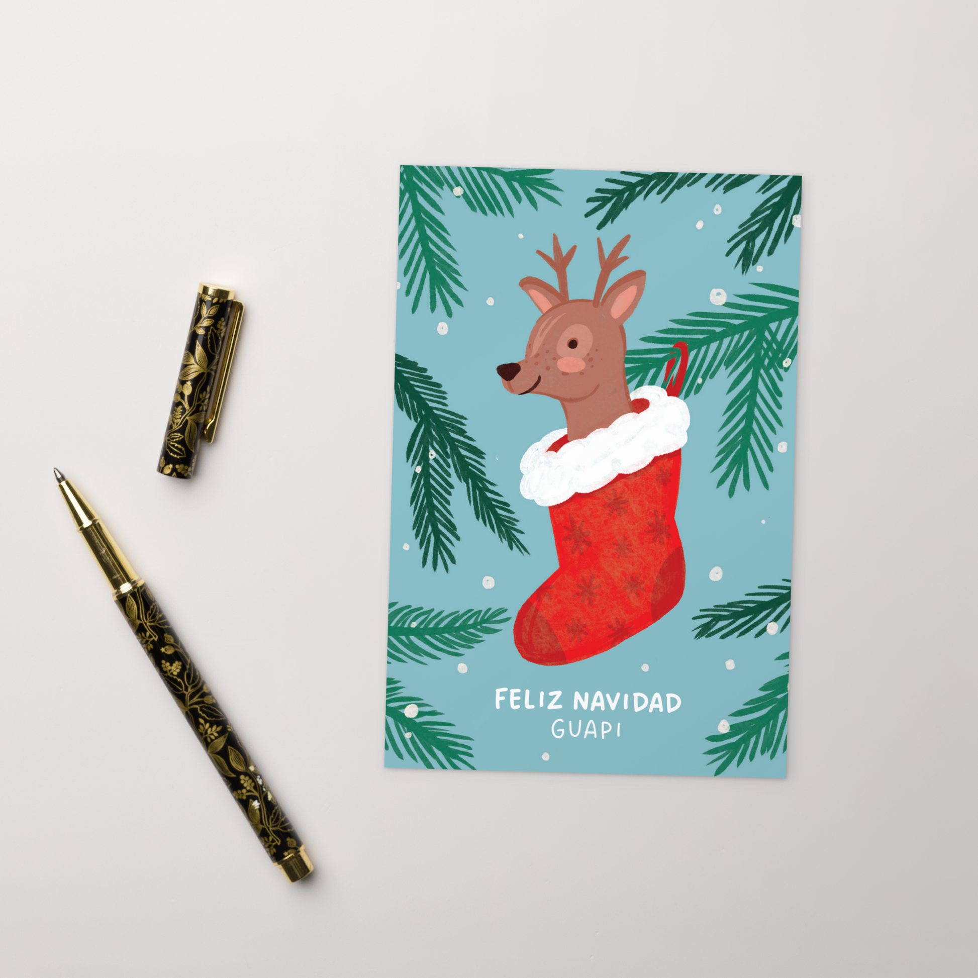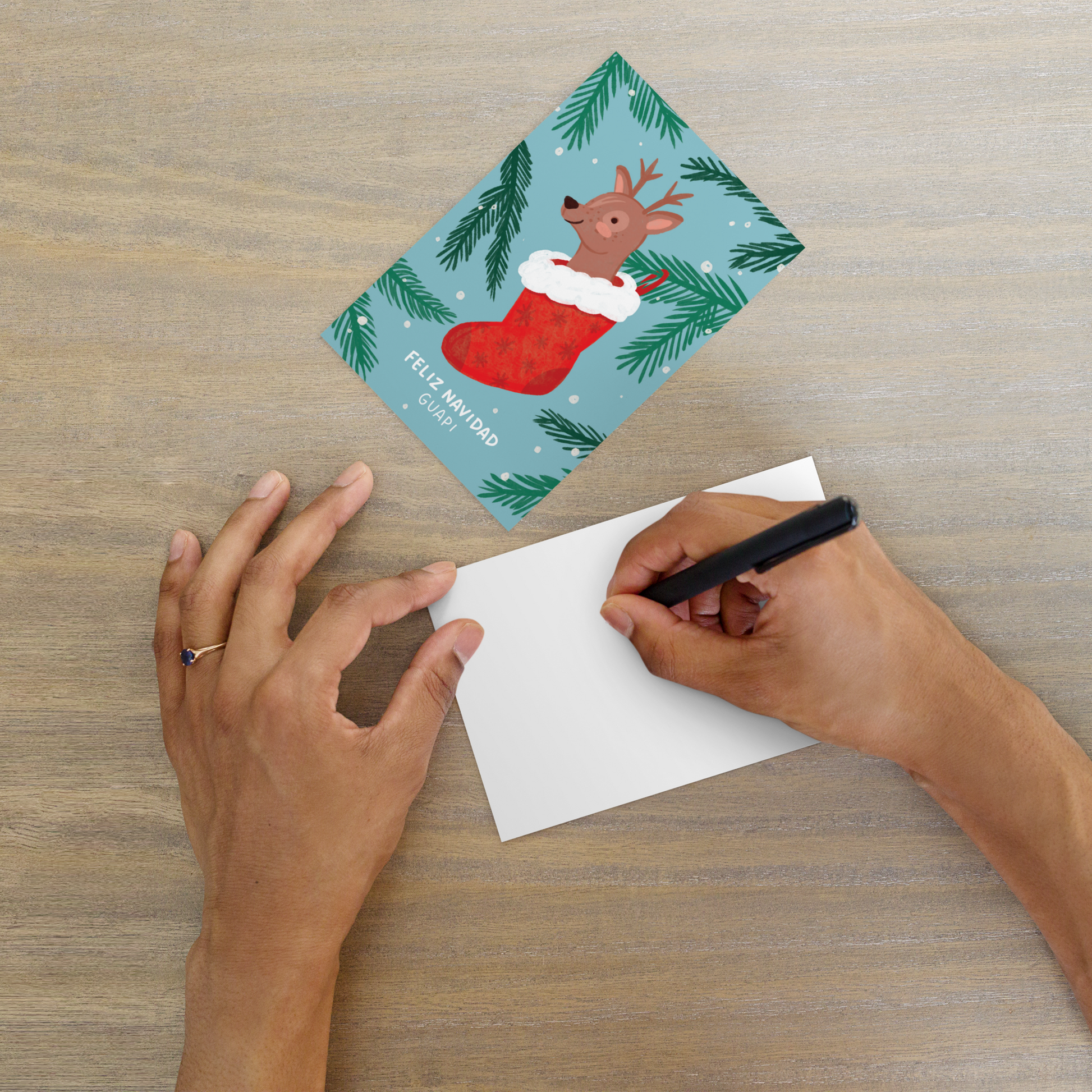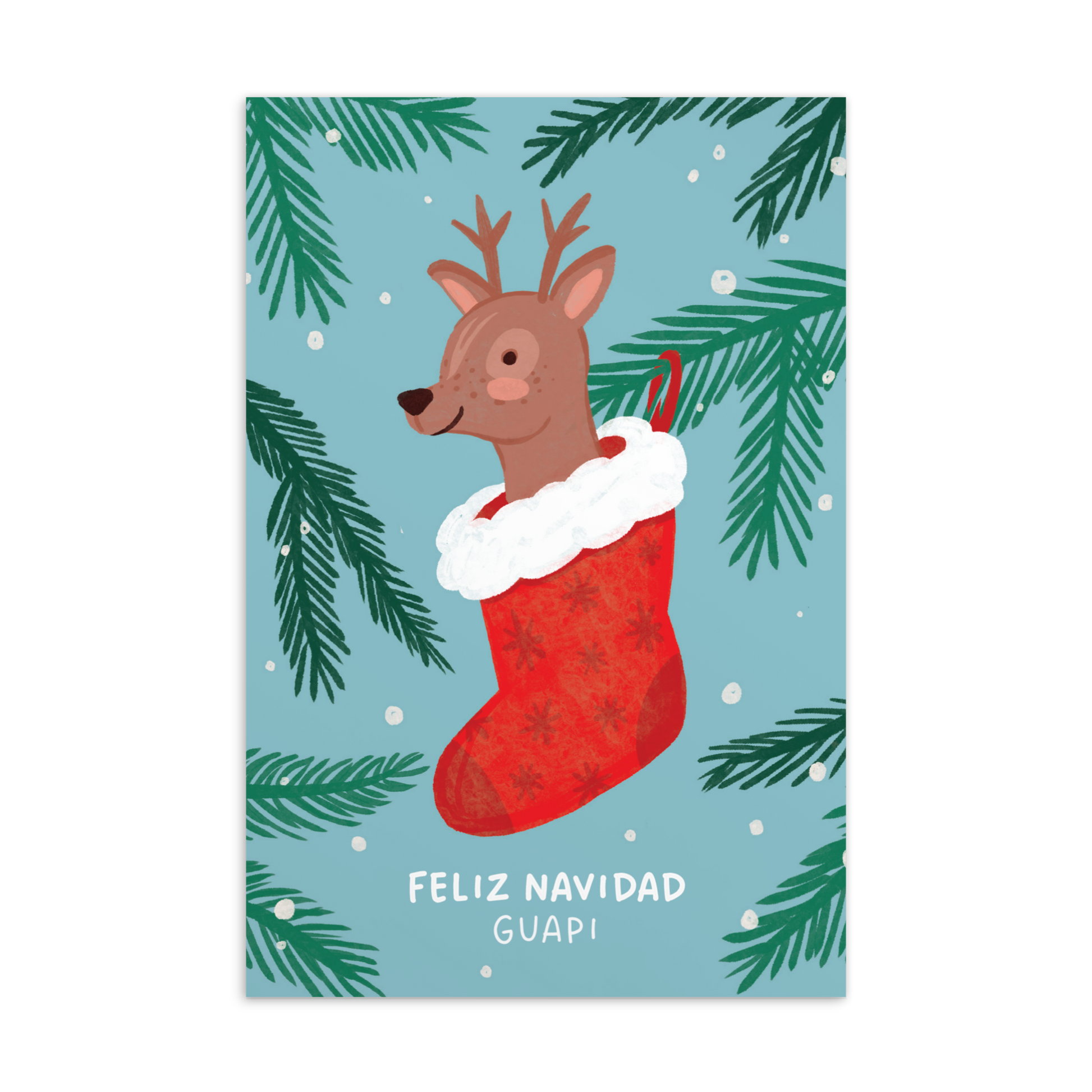 Esta postal navideña de reno en calcetín es la manera perfecta de enviar una carta de Navidad a tu familia y amigos. Comparte tus mejores deseos y transmite el espíritu navideño con esta postal ilustrada de reno de Papá Noel, un adorable animal navideño dentro de un calcetín de Navidad.